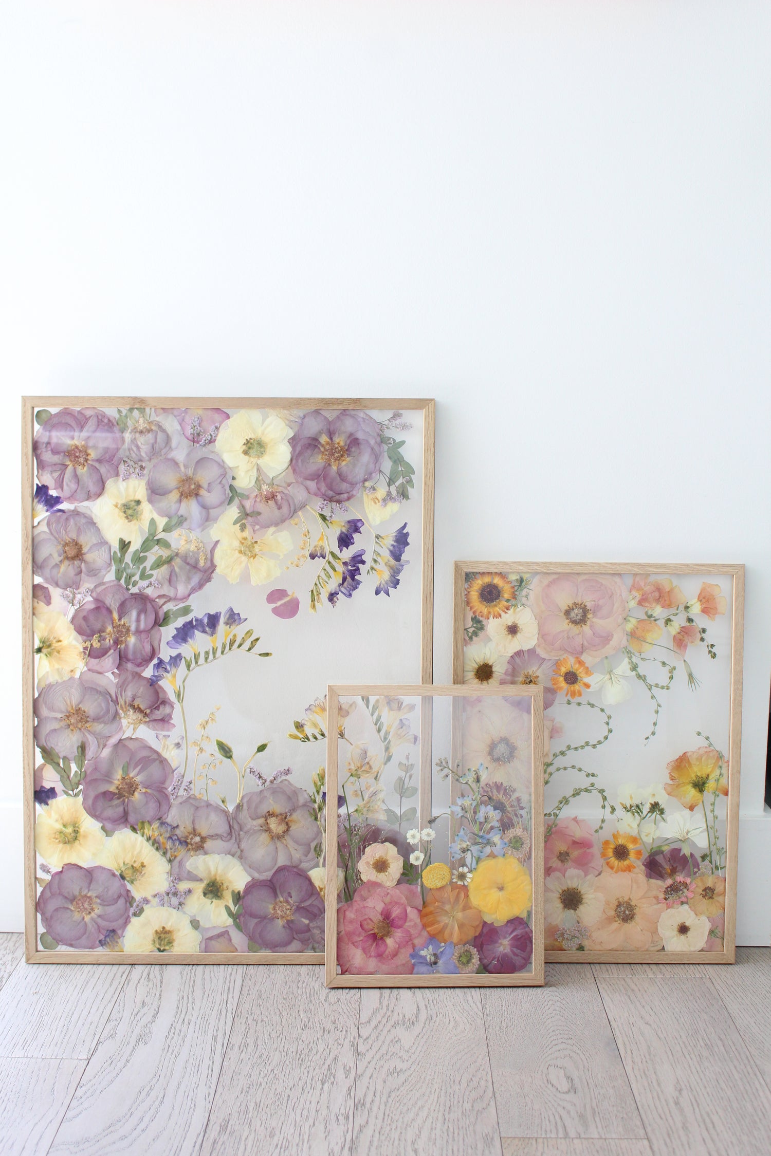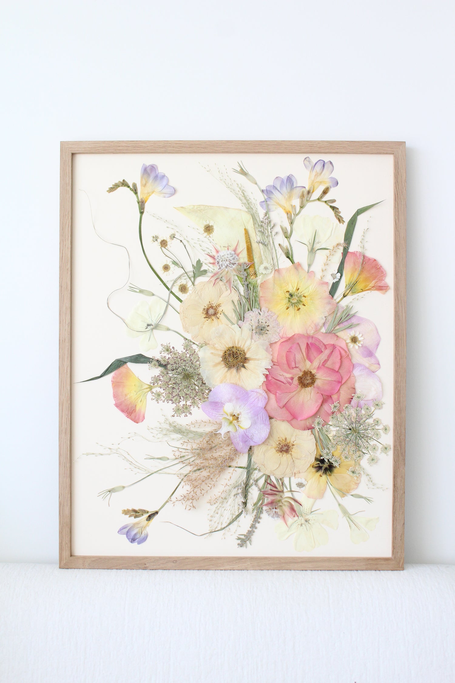 Pressing and preserving flowers is a natural, time-intensive process that cannot be rushed. Every piece is created with love and care to ensure it is truly one-of-a-kind and not a mass-produced design. From the moment I receive your flowers to the completion of your framed artwork, the process takes approximately six months.