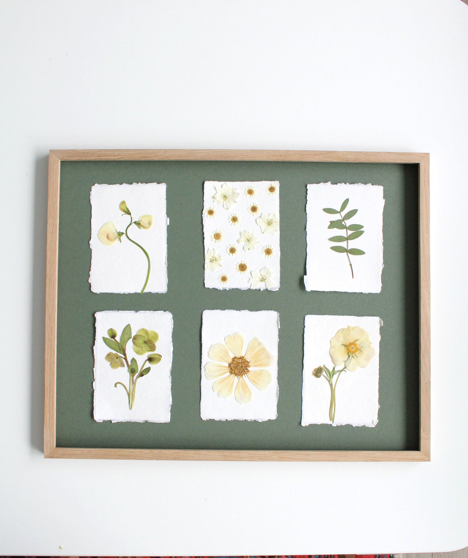 Sustainably made oak wood frames have off white or cream background, as flowers will be glued to an artisan paper board